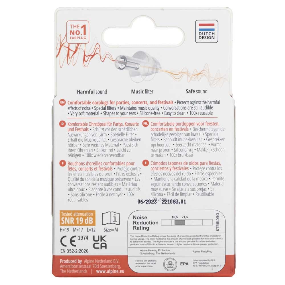 Festivaaleilla tai konserteissa, äänenvoimakkuus on usein niin korkea, että kuulosi voi heikentyä jo 15 sekunnissa. Oikeanlaisen kuulonsuojan käyttäminen on tärkeää tämän estämiseksi. Ääniaallot voidaan jakaa kolmeen taajuusalueeseen: korkeat, keskitaajuudet ja matalat taajuudet. Alpine PartyPlug-korvatulpat vähentävät melua keskimäärin 19 dB, ja takaavat korkeiden, haitallisten äänien täydellisen vaimennuksen samalla kun musiikin laatu ja puheen ymmärrettävyys säilyvät optimaalisina. Jokaisessa pakkauksessa on ylellinen matkakotelo, jossa korvatulpat voi säilyttää ja kuljettaa kätevästi ja turvallisesti.
