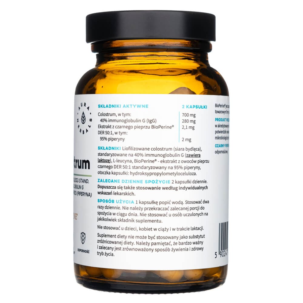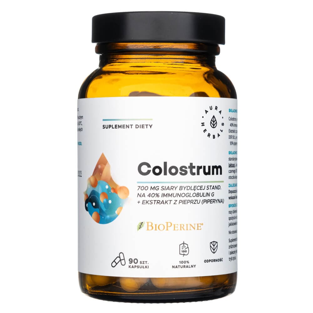 Colostrum on kapseleissa oleva ravintolisä Aura Herbals,:stä, joka sisältää 700 mg naudan Colostrum:aa, joka on standardoitu 40%:iin immunoglobuliini G:tä,:tä ja johon on lisätty tuotemerkillä varustettua BioPerine ® mustapippuriuutetta, joka on standardoitu 95%:iin piperiiniä. Lisäravinteen sisältämä mustapippuri edistää ruoansulatusta ja ravintoaineiden imeytymistä, ja tehostaa muiden kasviperäisten ainesosien tehokkuutta.
