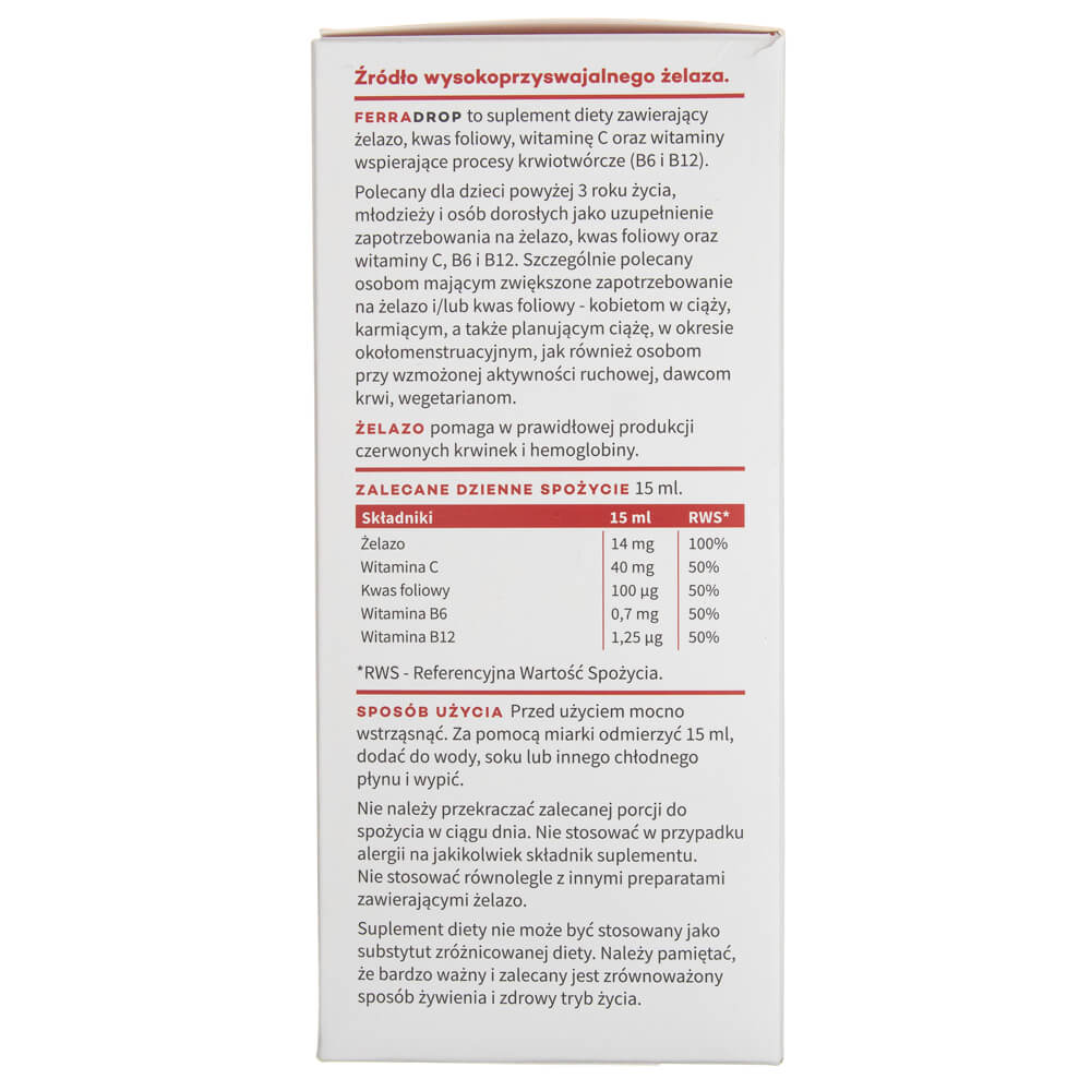 Ferradrop on ravintolisä Aura Herbals, joka sisältää rautaa + C-vitamiinia + B6-vitamiinia, B9 ja B12. Raudan erityisominaisuudet tukee punasolujen ja hemoglobiinin oikeanlaista tuotantoa tukee immuunijärjestelmän oikeanlaista toimintaa auttaa ylläpitämään oikeanlaisia kognitiivisia toimintoja vähentää väsymyksen ja uupumuksen tunnetta Foolihapon erityisominaisuudet (B9-vitamiini) folaatit tukevat immuunijärjestelmän oikeanlaista toimintaa folaatit auttavat oikeanlaisessa verentuotannossa folaatit edistävät äidin kudosten kasvua raskauden aikana folaatit osallistuvat solujen jakautumisprosessiin