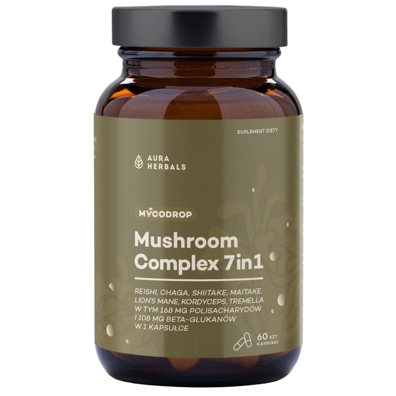 Aura Herbals Mushroom Complex 7-in-1 is a dietary supplement in vegan cellulose capsules containing 7 standardised extracts from the fruiting bodies of functional mushrooms (DER 30:1): reishi, chaga, shiitake, maitake, lion’s mane, Chinese cordyceps and tremella. 1 capsule provides a total of 560 mg of extracts, including 168 mg of polysaccharides and 108 mg of beta-glucans. The product is vegan and free from unnecessary additives. Does not contain: gluten, lactose, gelatine, colourings or preservatives.