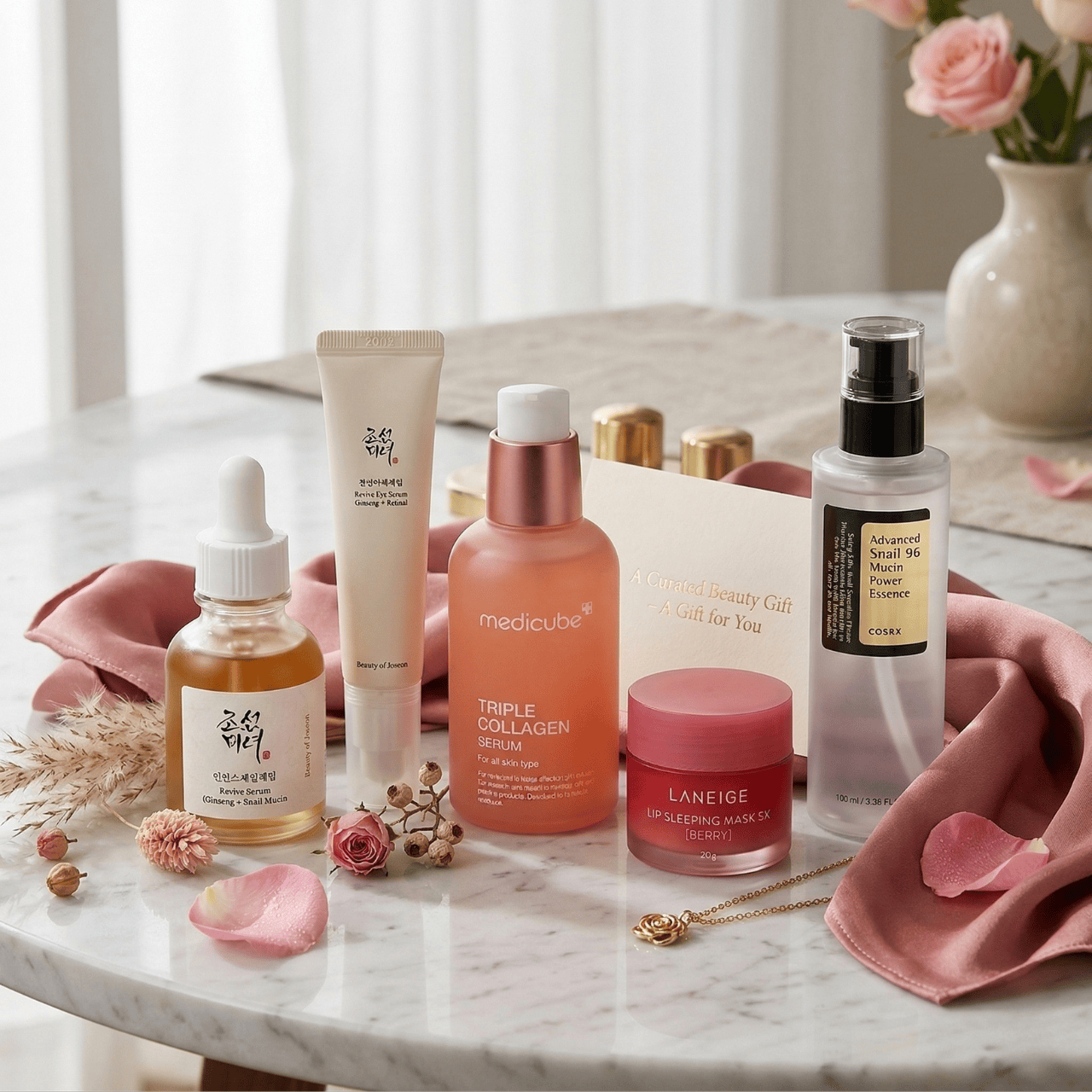 K-Beauty Anti-Aging -lahjasetti yhdistää viisi tehokasta ihonhoidon välttämättömyystuotetta, joiden voimanlähteenä ovat etanamukiini, ginseng, merikollageeni ja peptidit – joitakin korealaisen kauneudenhoidon tunnetuimpia ainesosia. Tämä huolella koottu iltarutiini kohdistuu ikääntymisen näkyviin merkkeihin, palauttamalla kiinteyttä, hehkua ja syvää kosteutusta kypsälle iholle.