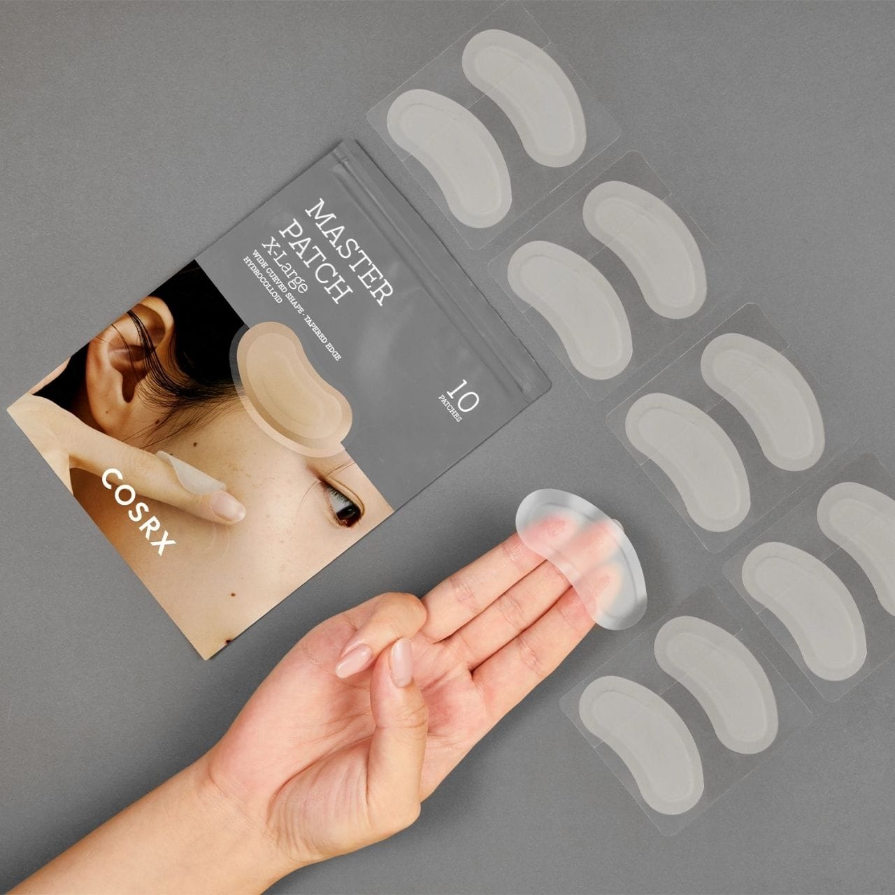 COSRX Master Patch X-Large ovat suuria, parantavia paikkaplästereitä XL-koossa, jotka peittävät suuremman alueen ihon epäpuhtauksista kuin tavalliset plästerit. Koostumuksessa oleva niasiiniamidi säätelee talin tuotantoa, sillä on tulehdusta hillitseviä ominaisuuksia ja se nopeuttaa paranemista, kun taas okklusiivinen polyisobutyleeni suojaa ihoa ulkoisilta tekijöiltä koko yön ajan.