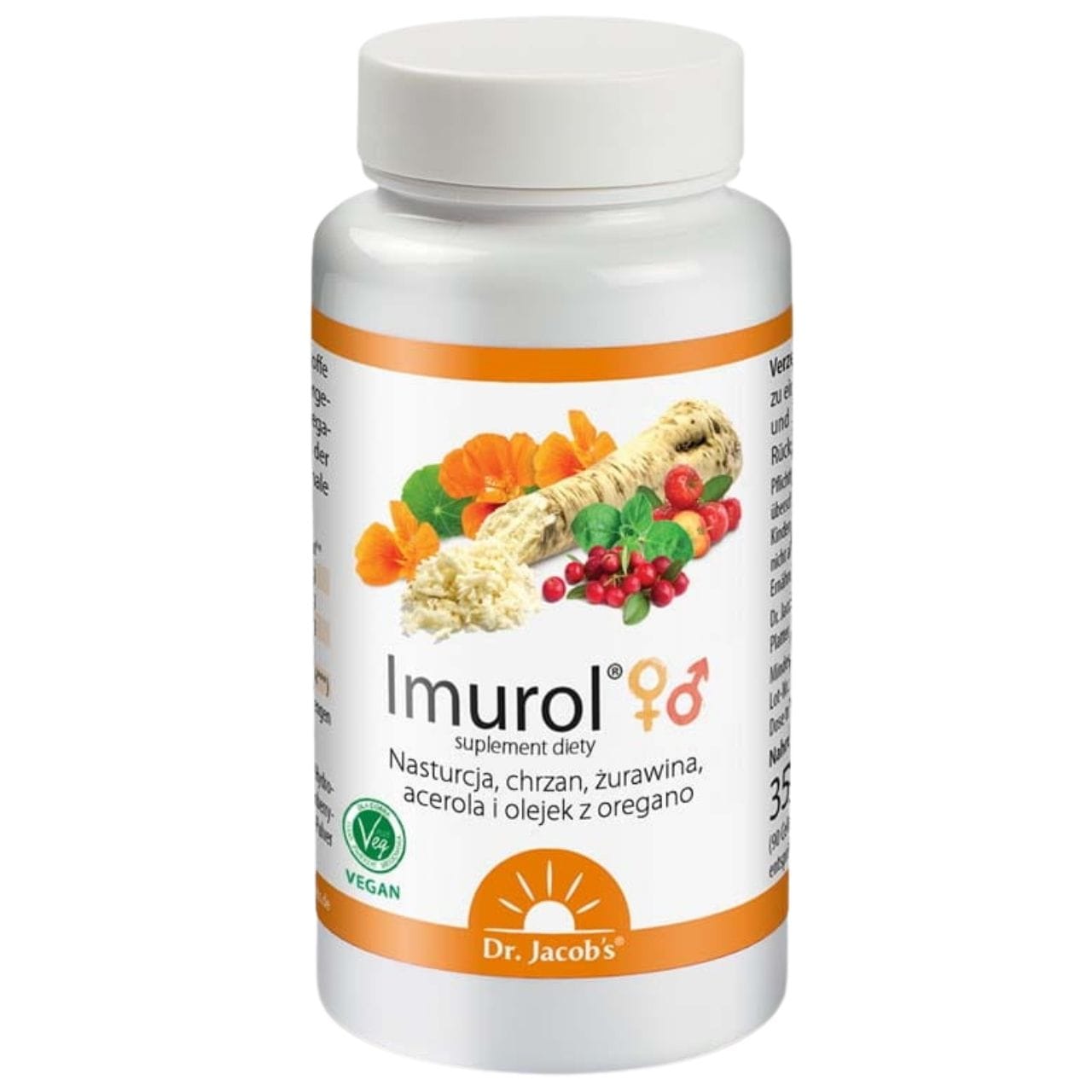 Dr. Jacob's Imurol is a dietary supplement in vegan capsules containing freeze-dried nasturtium powder, powdered horseradish, cranberry extract, oregano oil and acerola cherry extract as a source of vitamin C (40 mg — 50% RDA) per daily dose (3 capsules). Vitamin C contributes to the normal functioning of the immune system and protects cells from oxidative stress. The product is vegan and gluten-free.
