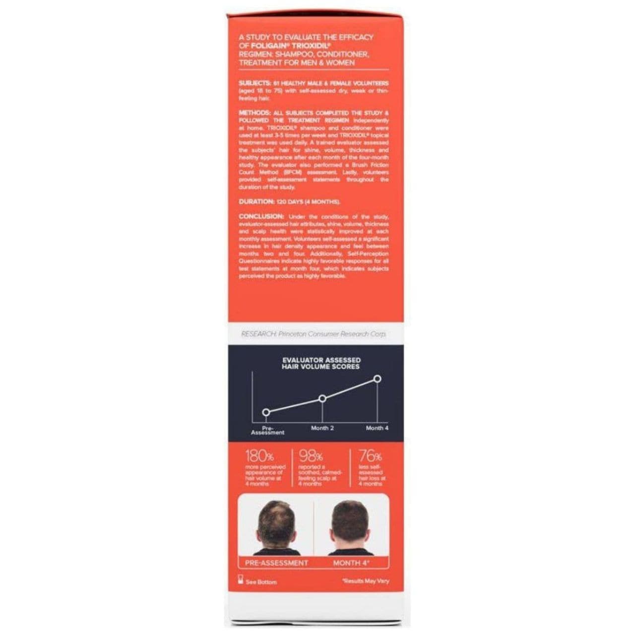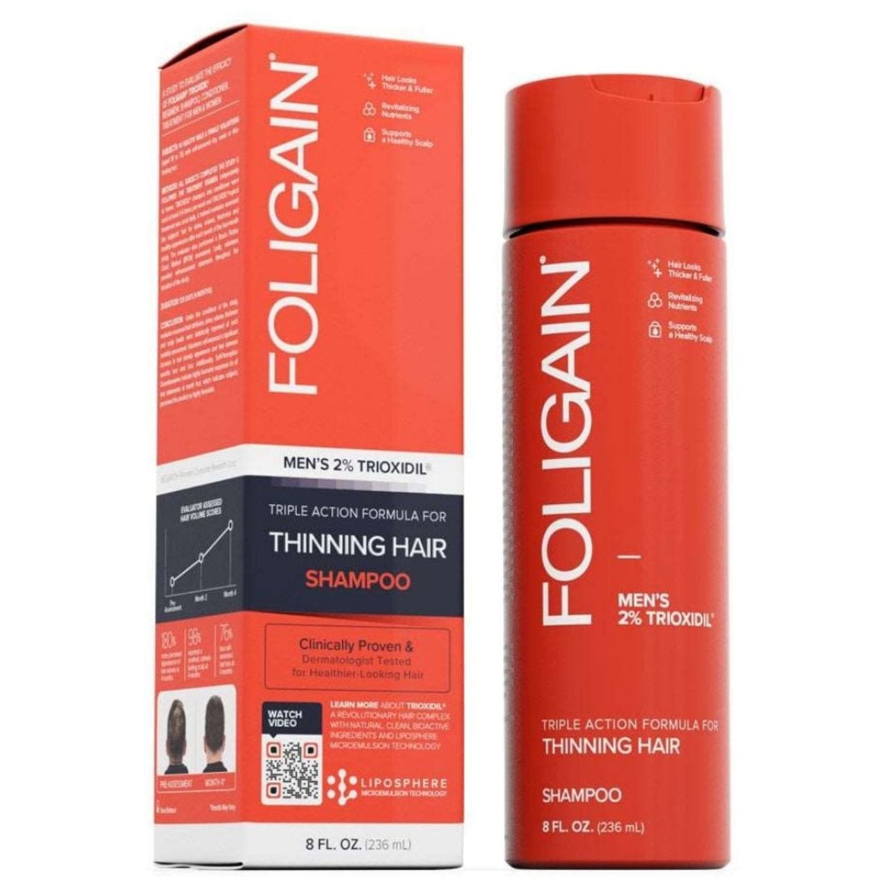 FOLIGAIN-shampoo, jossa on 2% trioksidilia , on kliinisesti testattu formula ohentuneille hiuksille. Se sisältää patentoidun Trioxidil-kompleksin , jonka on tutkimuksissa osoitettu lisäävän hiusten määrää 180% neljässä kuukaudessa ja vähentävän hiustenlähtöä 76% . Se estää DHT:n, puhdistaa päänahan ja vahvistaa karvatuppia. Ei sisällä parabeeneja, sulfaatteja eikä ftalaatteja !