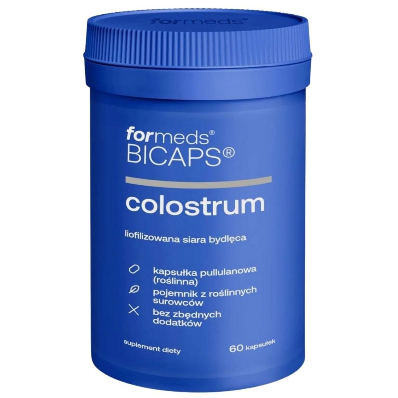 Formeds Bicaps Colostrum on ravintolisä kapselimuodossa. Se on pakastekuivattua naudan Colostrum, joka on saatu ensimmäisten 24 tunnin aikana syntymän jälkeen. Tämä varmistaa, että se säilyttää täyden stabiilisuutensa ja biologisen aktiivisuutensa. Colostrum standardoitu immunoglobuliineille (30%), laktoferriini (2,5%) ja polypeptidit runsaasti proliinia (2%).