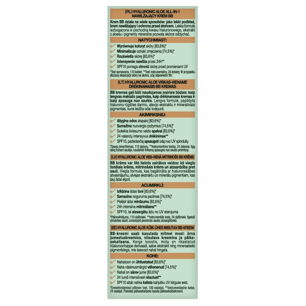 Garnier BB Creamon monikäyttöinen tuote, jossa yhdistyvät kevyen meikkivoiteen, kosteusvoiteen ja aurinkosuojan ominaisuudet. Sen kevyt koostumus, rikastettu hyaluronihappojohdannaisella, aloe vera -uutteella ja mineraalipigmenteillä, antaa ihon hengittää ja sopii kaikille ihotyypeille. BB-voide tasoittaa ihon sävyä välittömästi, minimoi väsymyksen merkkejä, kirkastaa ihoa ja kosteuttaa intensiivisesti 24 tuntia ja antaa samalla SPF10-suojan.