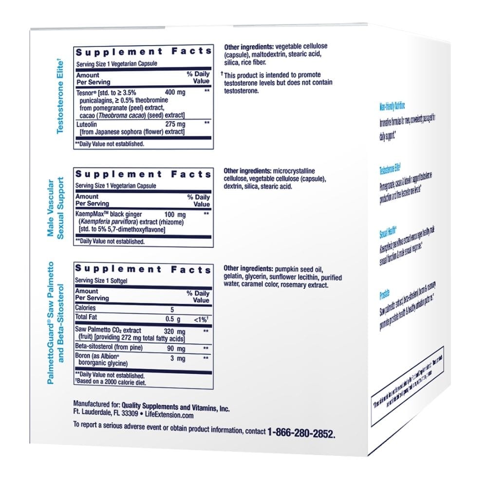 Miehille räätälöity päivittäinen terveystuki: Men's Vitality Packissa yhdistyvät kolme koostumusta miesten seksuaaliterveyden, terveen vapaan ja kokonaistestosteronitason, sekä eturauhasen ja virtsateiden terveyden Life Extension Men's Vitality Pack on ravintolisä, joka on saatavana kätevissä kapselipussukoissa.