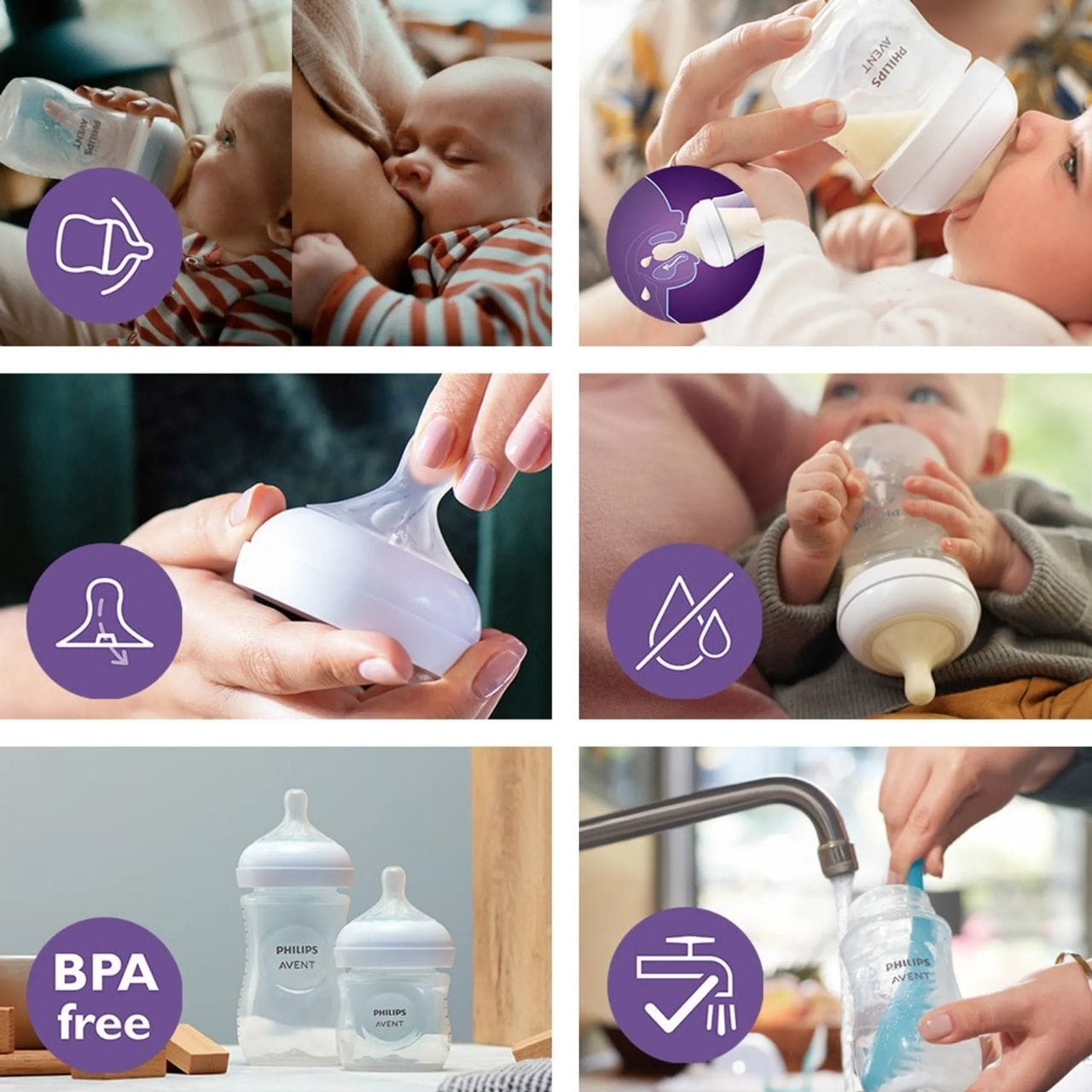 Innovatiivinen Responsive Natural -pullo, jossa on reagoiva nänni, on suunniteltu jäljittelemään äidin rintaa. Ainutlaatuinen J-rakoinen tutti varmistaa, että maitoa virtaa vain, kun vauva imee aktiivisesti - aivan kuten imettäessä. Vauva imee, nielee ja hengittää omaan tahtiinsa, ja kun hän pitää tauon, maito lakkaa virtaamasta. Varustettu koliikkivastaisella venttiilillä koliikkien ja epämukavuuden riskin vähentämiseksi. Valmistettu bisfenoli A:ta sisältämättömistä materiaaleista, se yhdistyy täydellisesti muihin Avent-sarjan tuotteisiin.