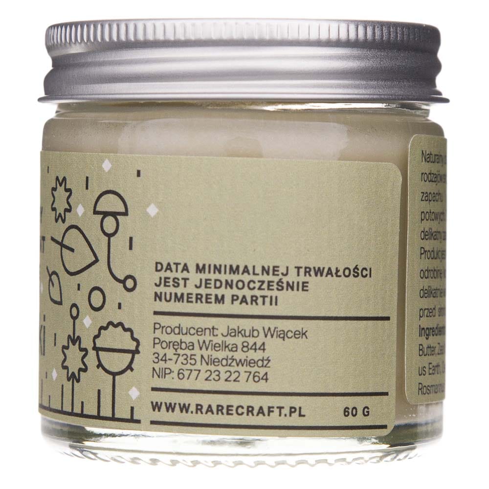 Luonnollinen deodorantti voiteena on toinen RareCraft:n tuotteista. Sisäiseen reseptiin perustuva, deodorantti on puolalainen tuote, joka on valmistettu Krakovan lähellä sijaitsevassa tehtaassa. Sen sisältämät luonnolliset ainesosat poistavat epämiellyttävät hajut ja imevät kosteutta tukkimatta hikirauhasia. Eteeriset öljyt - sitruuna ja rosmariini - antavat raikkaan, vartalolle herkän, tuoksun, joka antaa miellyttävän tunteen koko päiväksi. Kevyen koostumuksensa ansiosta, voide levittyy täydellisesti iholle.
