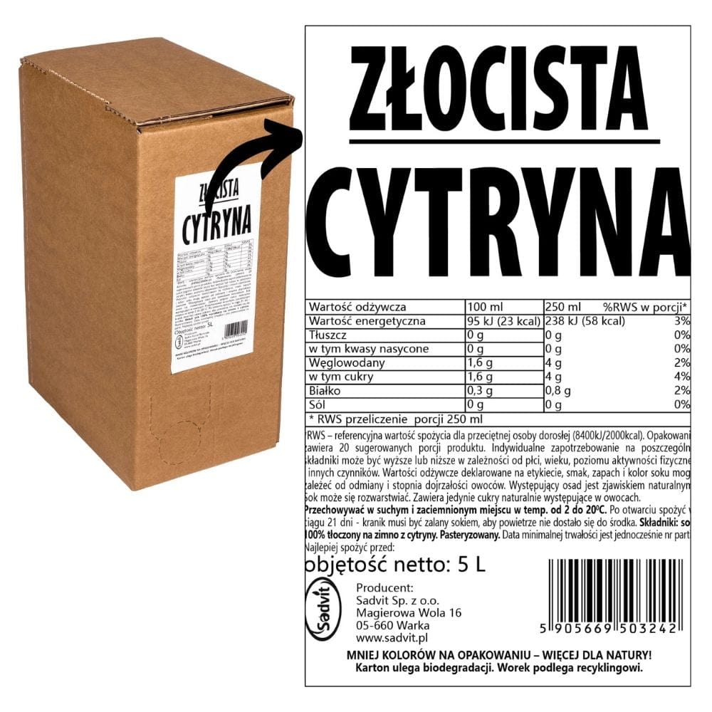 Sadvit Lemon Juice Golden Lemon 100% on NFC (ei tiivisteestä valmistettu) kylmäpuristettu mehu, joka sisältää vain sitruunoita. Pastöroitu, ilman lisättyä sokeria tai makuaineita.