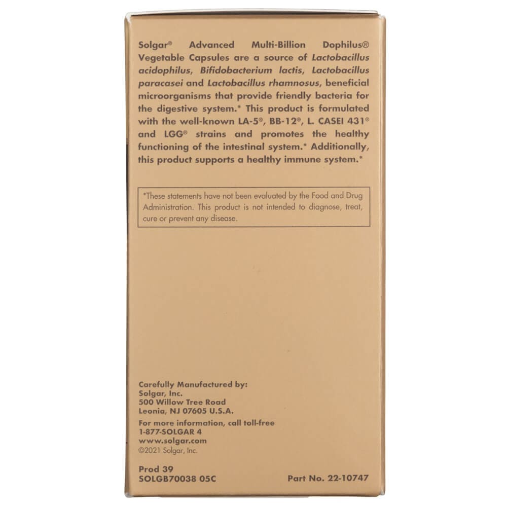 Solgar ® Advanced Multi-Billion Dophilus ® Kasviskapselit sisältävät Lactobacillus acidophilus, Bifidobacterium lactis, Lactobacillus paracasei ja Lactobacillus rhamnosus, hyödyllisiä mikro-organismeja, jotka tarjoavat ystävällisiä bakteereja ruoansulatuskanavalle. Tässä tuotteessa on käytetty tunnettuja LA-5 ®, BB-12 ®, L. CASEI 431 ® ja LGG ® -kantoja ja se edistää suoliston tervettä toimintaa. Lisäksi, tämä tuote tukee tervettä immuunijärjestelmää.