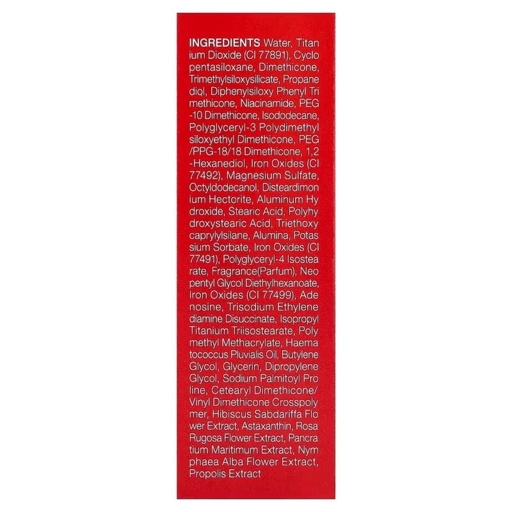 Vesi, titaanidioksidi (ci 77891), syklopentasiloksaani, dimetikoni, trimetyylisiloksisilikaatti, propaanidioli, difenyylisiloksifenyylitrimetikoni, niasiiniamidi, peg -10 dimetikoni, isododekaani, polyglyseryl-3 polydimetyylisiloksietyylidimetikoni, peg /ppg-18/18 dimetikoni,1,2 -heksanedioli, rautaoksidit (ci 77492), magnesiumsulfaatti, oktyylidodekanoli, disteardimoniumhektoriteetti, alumiinihydroksidi, steariinihappo, polyhydroksisteariinihappo, trietoksikaprylyylisilaani, alumiinioksidi, kaliumsorbaatti, rautaoksidit (ci 77491), polyglyseryl-4-isostearaatti, hajuste (parfum), neopentyyliglykolidietyyliheksanoaatti, rautaoksidit (ci 77499), adenosiini, trinatriumetyleen diamiinidisukkinaatti, isopropyylititaanitriisostearaatti, polymetyylimetakrylaatti, haematococcus pluvialis -öljy, butyleeniglykoli, glyseriini, dipropyleeniglykoli, natriumpalmitoiliprolin, setearyylidimetikoni/vinyylidimetikoni-ristipolymeeri, hibiscus sabdariffa -kukkauute, astaksantiini, rosa rugosa -kukkauute, pancra tium maritimum -uute, nymphaea alba -kukkauute, propolis-uute.