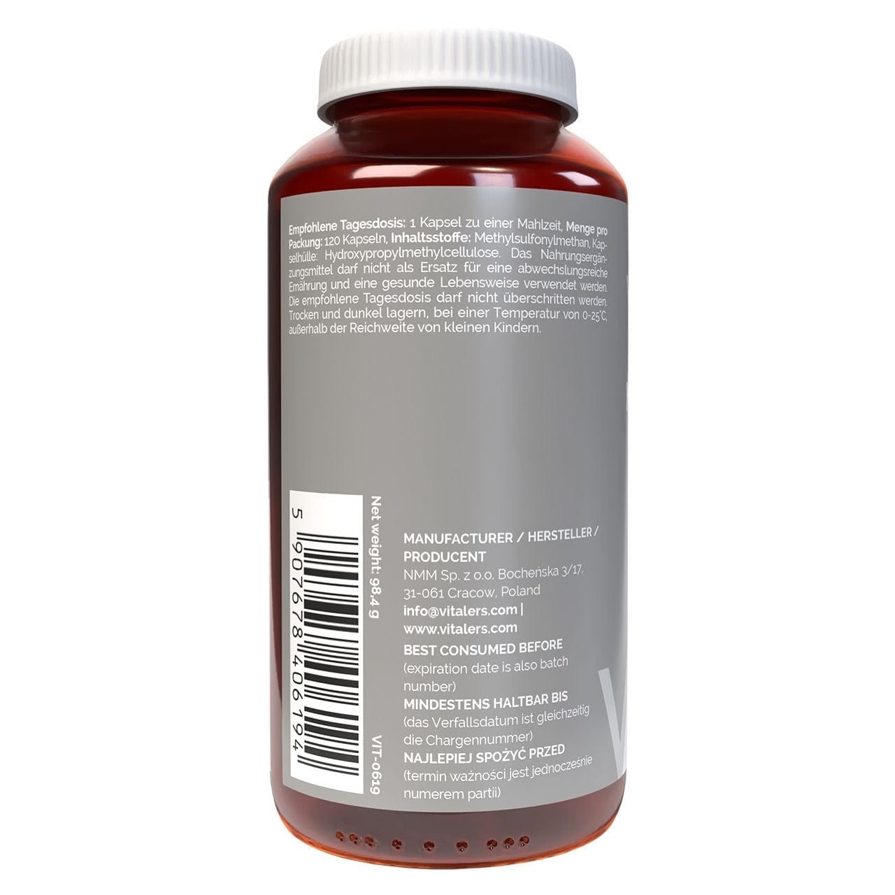 Vitaler's MSM ( Orgaaninen rikki ) 1000 mg on ravintolisä kapselimuodossa, joka sisältää 1000 mg metyylisulfonyylimetaania ( MSM ) . MSM on orgaaninen rikkiyhdiste, jota esiintyy luonnostaan tietyissä hedelmissä ja vihanneksissa , sekä muissa elintarvikkeissa. HPMC-kapselit sopivat kasvissyöjille ja vegaaneille. 120 kapselia pakkauksessa. Ei sisällä: säilöntäaineita , aromiaineita , väriaineita , lisättyä sokeria.